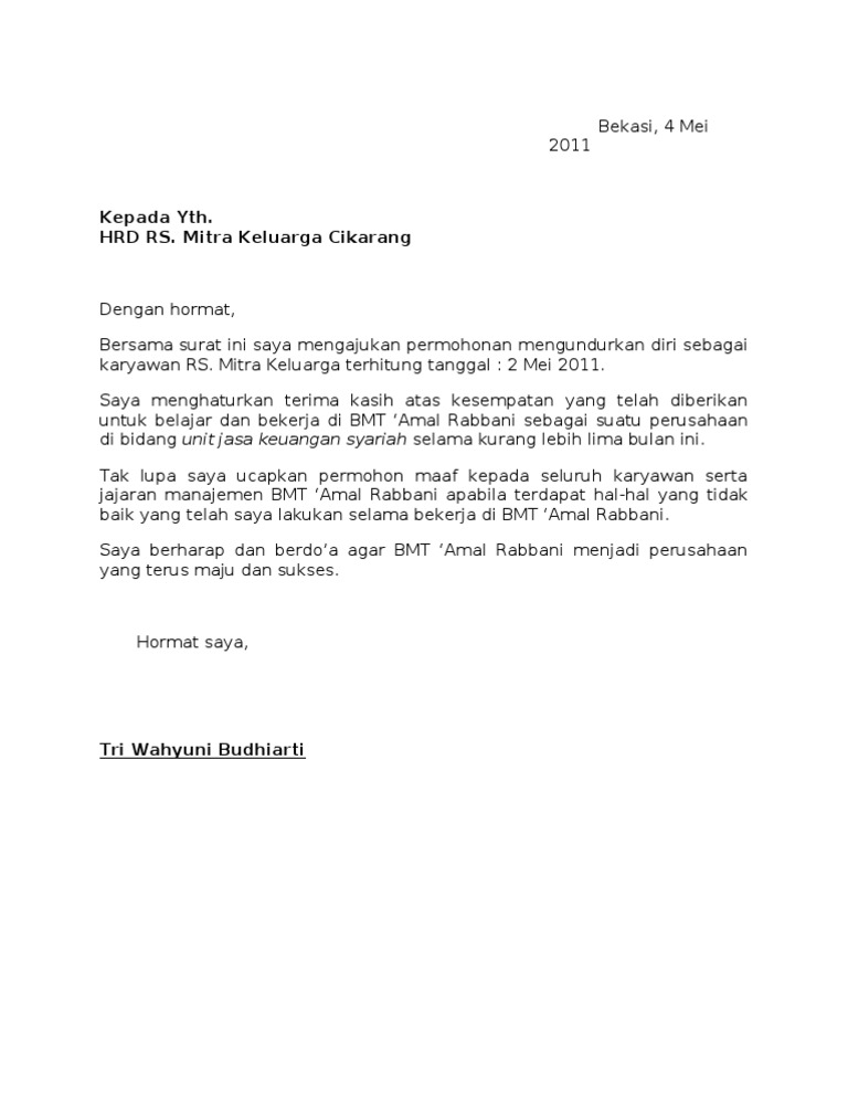 Surat pengunduran diri kerja sebagai karyawan memang sebaiknya tidak diberikan ke perusahaan secara mendadak. Yang bertanda tangan dibawah ini. Contoh surat pengunduran diri langsung saja di kesempatan kemarin kita telah membahas tentang penulisan dan contoh surat lamaran kerja semua hal terkait pelamar dalam melamar kerja telah diulas disana. Tidak hanya itu, sebelum anda mengirimkan surat pengunduran diri ke perusahaan anda bekerja, maka anda harus memastikan terlebih dahulu proses pengunduran diri dari pekerjaan sudah benar dengan prosedur dari pengunduran diri karyawn yang berlaku di perusahaan tempat anda bekerja. Surat pengunduran diri kerja atau surat resign adalah sebuah jenis surat resmi yang isinya menyampaikan permohonan kepada atasan untuk berhenti dari pekerjaan. Kalau enggak demikian, pasti ada aja alasan yang akan membuat anda terpaksa untuk berhenti bekerja di perusahaan tersebut. Bagi kamu yang lagi pengen resign tapi. Contoh surat pengunduran diri kerja dan fungsinya. Selama masa 30 hari itu, perusahaan dapat mencari karyawan pengganti yang tepat, sehingga pekerjaan. Apabila alasan tersebut menyangkut orang lain dalam perusahaan. Contoh surat pengunduran diri dari rumah sakit. Mengundurkan diri dari sebuah perusahaan bukanlah hal yang mudah. Kepada yth pimpinan hrd pt jaya terus bersinar jl.